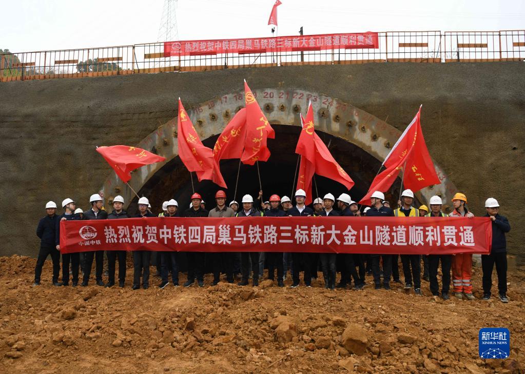 3月21日,中鐵四局施工人員在巢馬城際鐵路新大金山隧道口慶祝順利貫通。