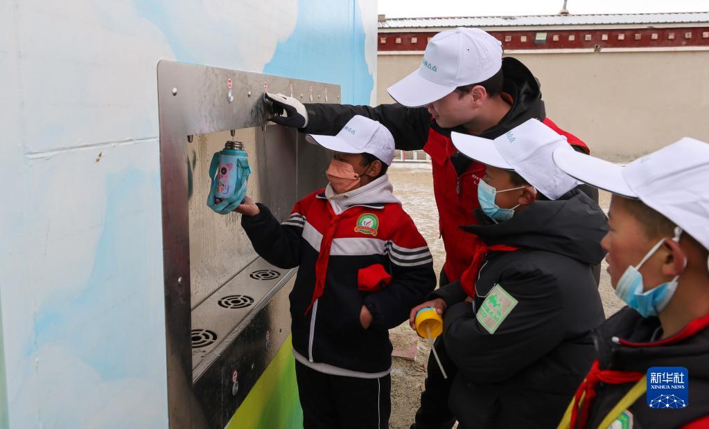 3月21日,那曲市色尼區香茂鄉小學(xué)的同學(xué)們在新啟用的凈水站打水。