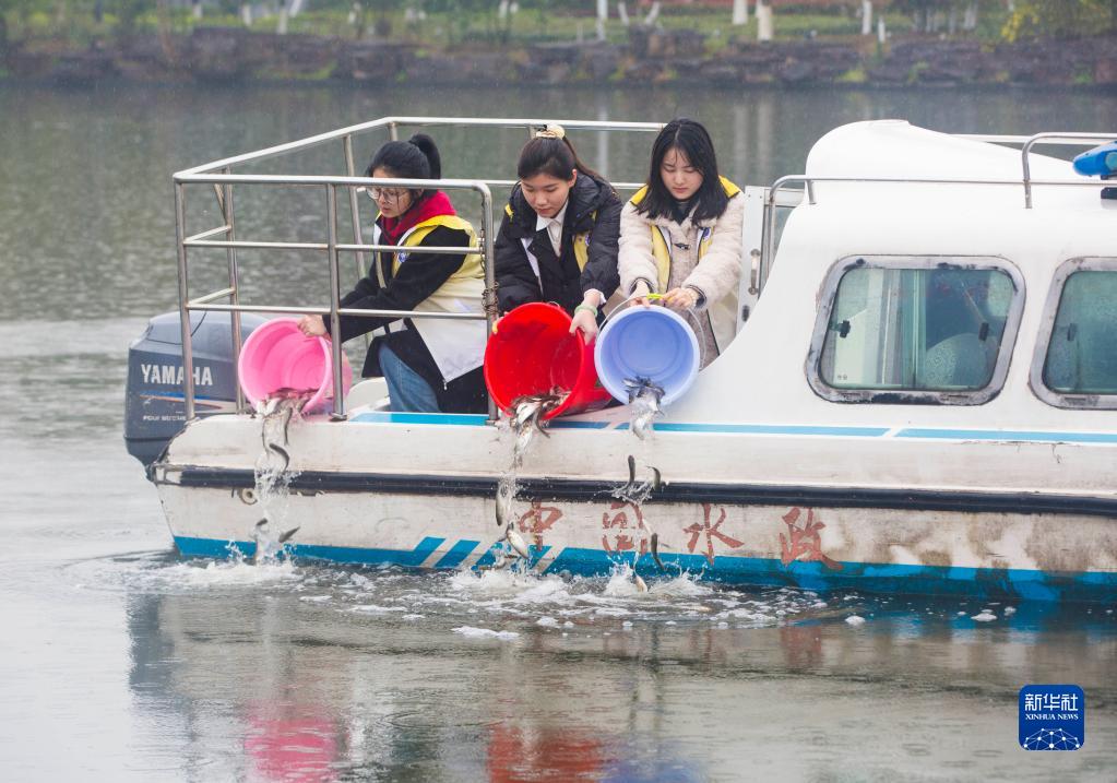 3月21日,在浙江省寧波市北侖區東泰河,志愿者將魚(yú)苗放流入河。