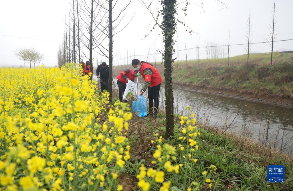 3月21日,在合肥市肥西縣銘傳鄉,志愿者在天河河岸邊清理垃圾。