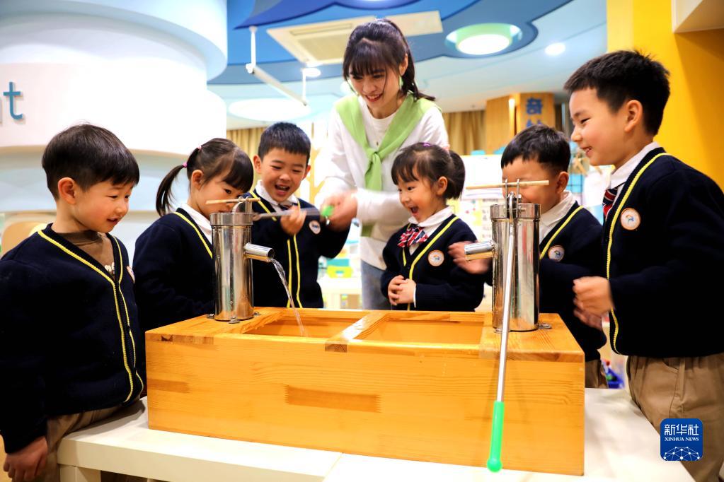 3月21日,在浙江省湖州市長(cháng)興縣實(shí)驗幼兒園科探室里,老師和孩子們一起體驗壓力井出水游戲。
