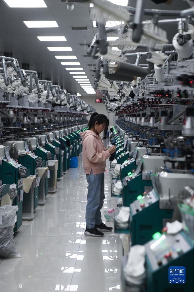 3月21日,在諸暨安華鎮的澗瀾襪業(yè)有限公司數字化車(chē)間內,工作人員在全自動(dòng)襪機旁查看襪子成品。
