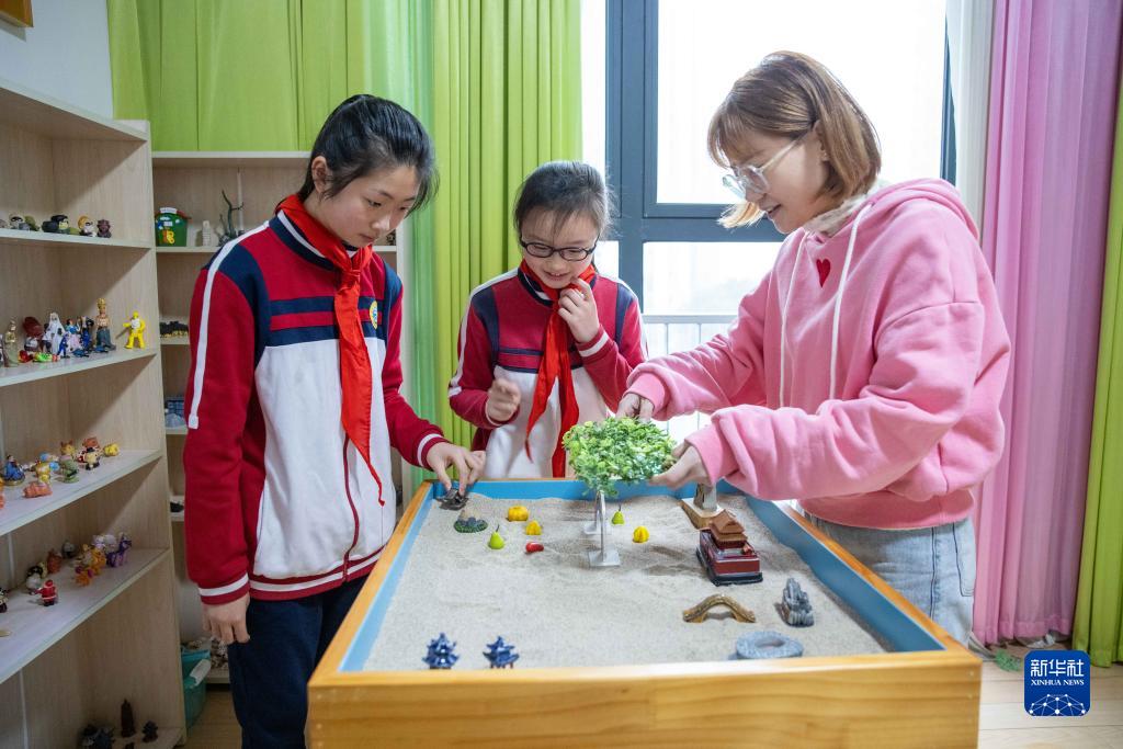 3月22日,寧波市江北區洪塘實(shí)驗學(xué)校的心理教師在心理輔導室陪學(xué)生一起擺放沙盤(pán)。