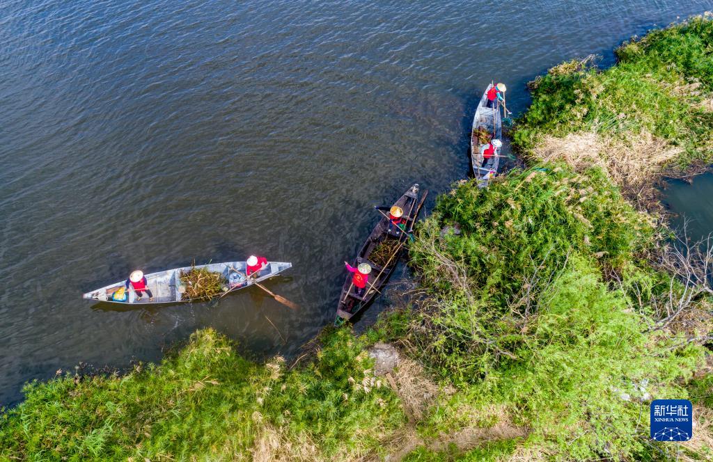 3月20日,巾幗打撈隊的姐妹們在滇池草海進(jìn)行打撈作業(yè)(無(wú)人機照片)。