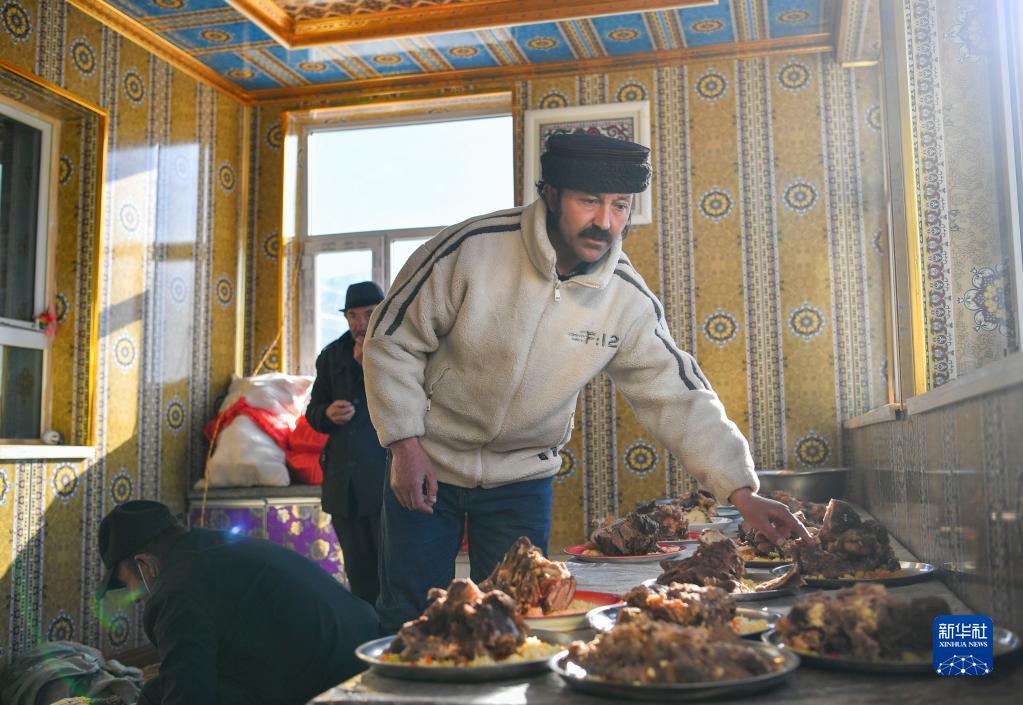 新郎買(mǎi)熱買(mǎi)提汗·青鐵木爾的一位長(cháng)輩在家中為親友準備牦牛肉手抓飯(3月19日攝)。