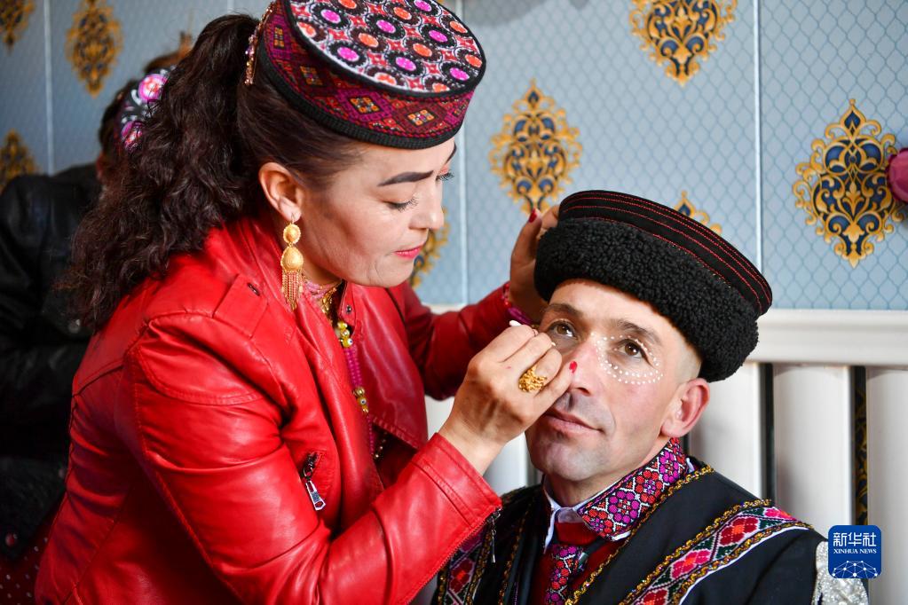 迎親前,親友用石粉在新郎買(mǎi)熱買(mǎi)提汗·青鐵木爾的眼周化妝(3月19日攝)。