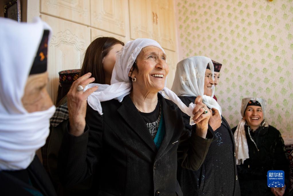 新郎買(mǎi)熱買(mǎi)提汗·青鐵木爾的母親和親友們在位于縣城的新家中有說(shuō)有笑(3月20日攝)。