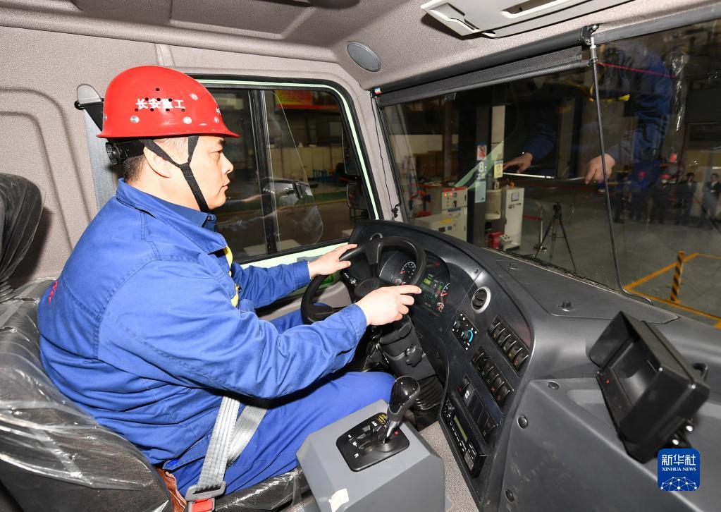 3月22日,中鐵長(cháng)安重工有限公司的工人在生產(chǎn)線(xiàn)上試乘即將下線(xiàn)的95噸純電動(dòng)礦用自卸車(chē)。