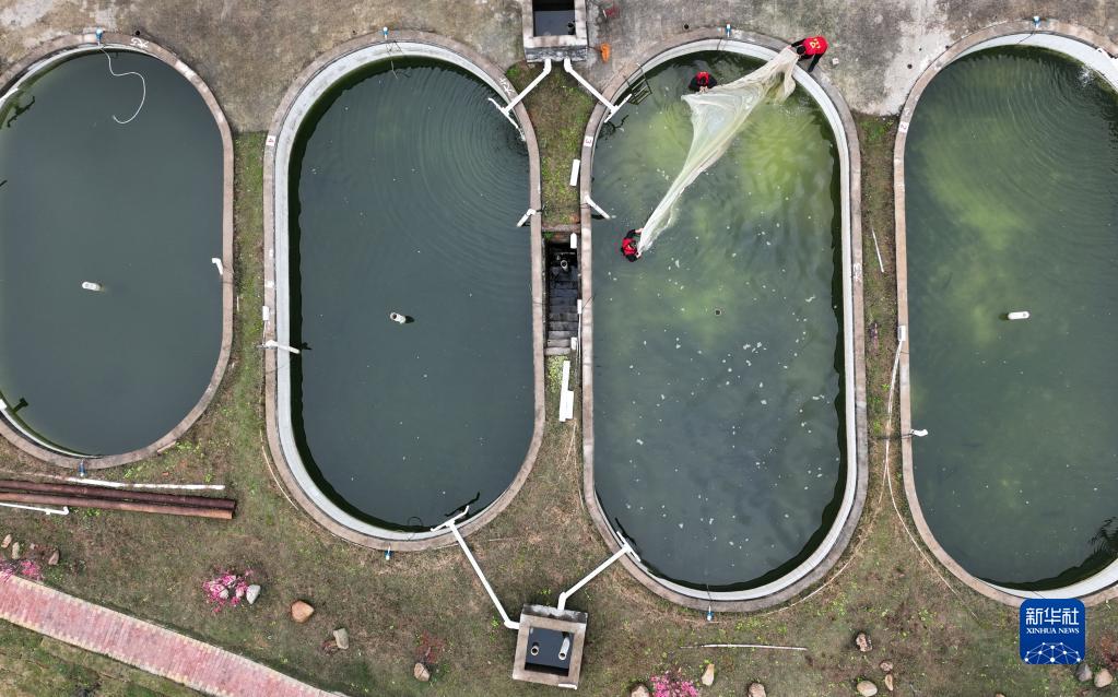 3月22日,衡山縣嶺坡鄉燈山村泉水魚(yú)養殖基地工作人員在捕魚(yú)(無(wú)人機照片)。