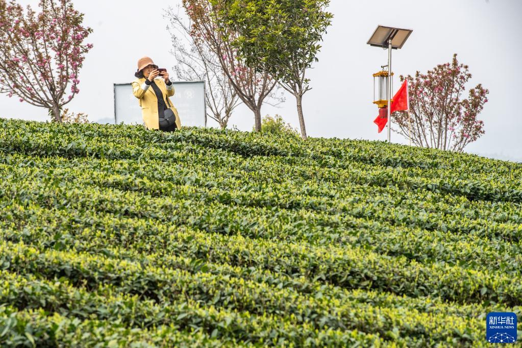 3月22日,在重慶市永川區永榮鎮鄉村振興就業(yè)園,游客在茶園內參觀(guān)游玩。