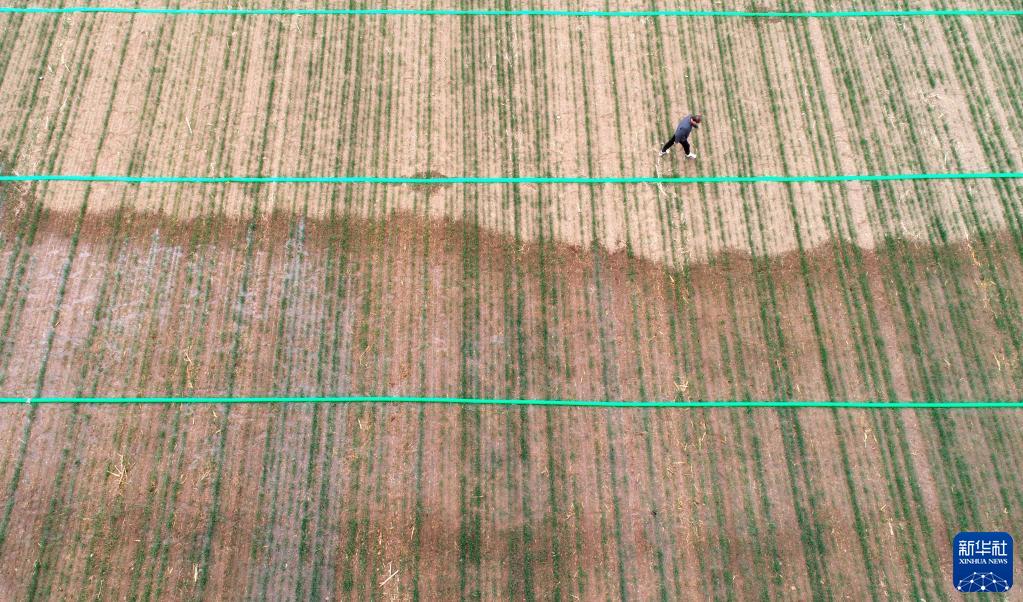 3月22日,在石家莊市欒城區南高村,村民采用微噴設備對小麥進(jìn)行灌溉(無(wú)人機照片)。