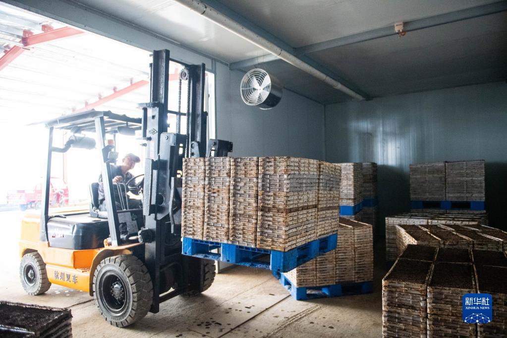 3月22日,在桃源縣金鳳橋水稻育秧工廠(chǎng),村民駕駛叉車(chē)把處理好的秧盤(pán)放入密室催芽。