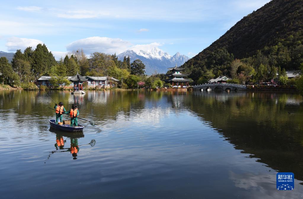 3月22日,在云南省麗江市古城區黑龍潭公園,環(huán)衛工人在打撈水面垃圾。