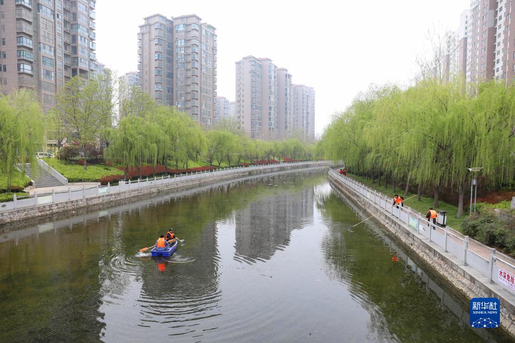 3月22日,在河南省平頂山市寶豐縣玉帶河,工作人員在清理河面上的漂浮物。