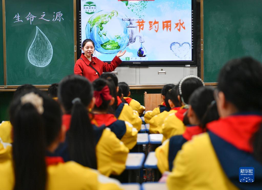 3月22日,在四川省廣安市前鋒區前鋒小學(xué),老師在講解節水護水知識。