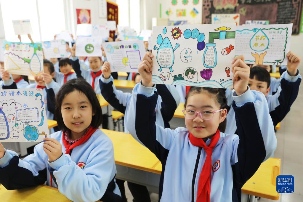 3月22日,河南省平頂山市寶豐縣山河路小學(xué)學(xué)生展示自己制作的節水護水畫(huà)報。
