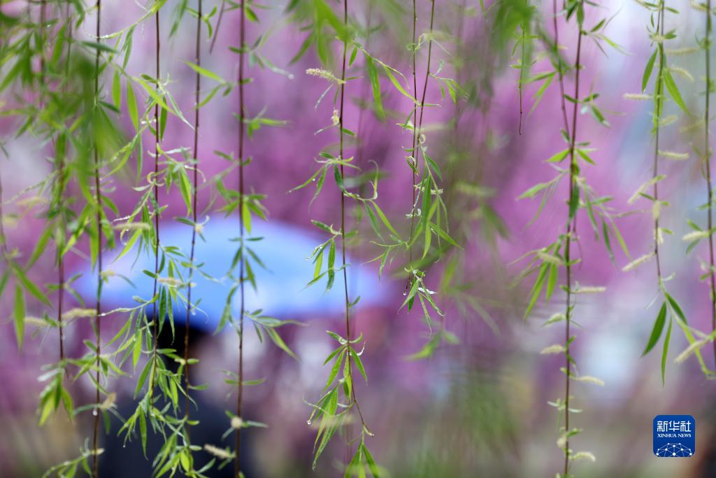 3月22日,在山東省棗莊市光明路街道西沙河畔,市民冒雨在河邊柳樹(shù)下行走。