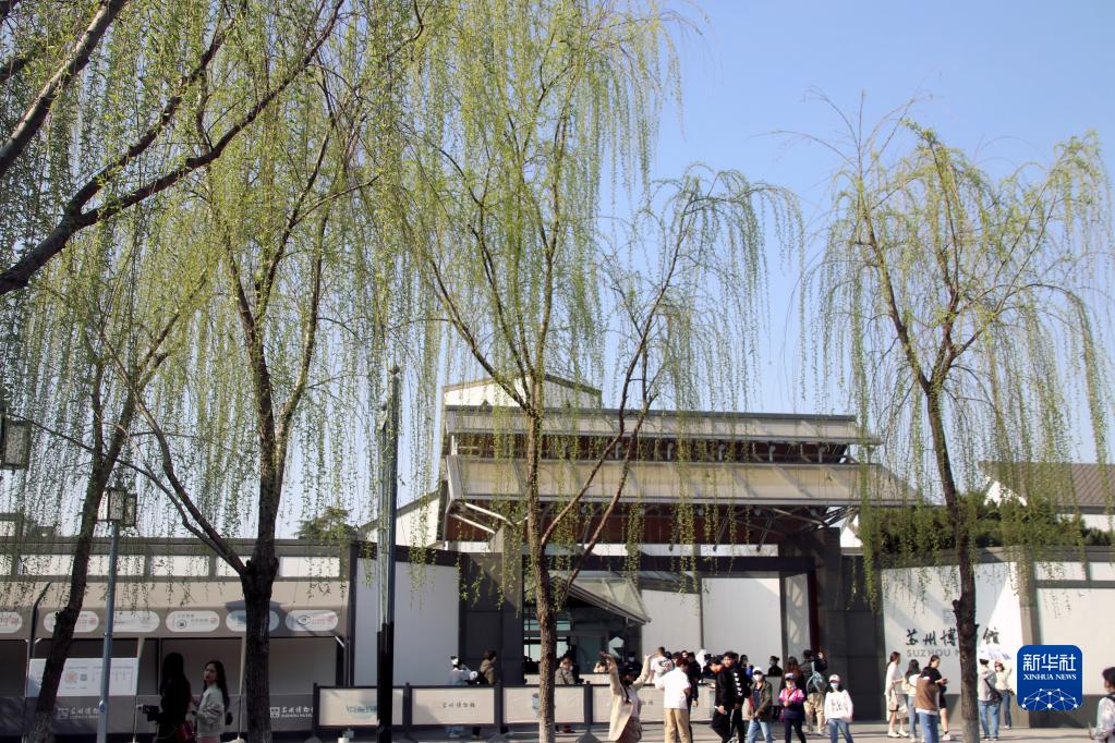 3月15日,游客從江蘇蘇州博物館旁的垂柳下經(jīng)過(guò)。