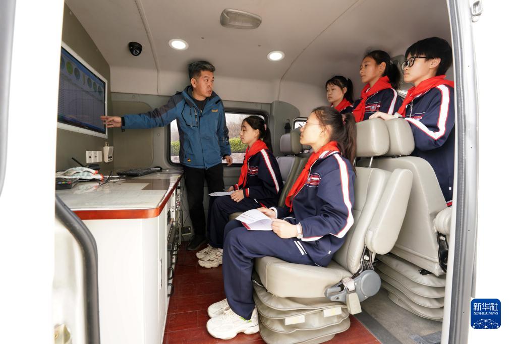 3月22日,河北省邢臺市第八中學(xué)學(xué)生在邢臺市氣象站參觀(guān)氣象應急車(chē)。