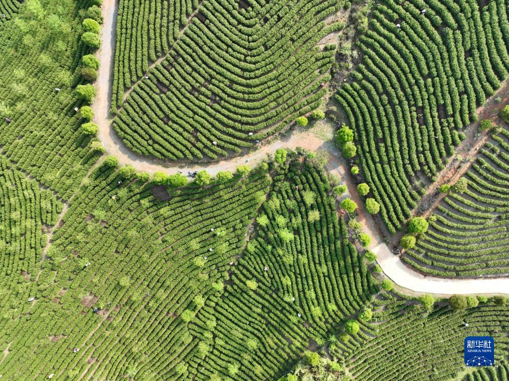 3月21日,在湖南省永州市江華瑤族自治縣橋市鄉大魚(yú)塘村,茶農在茶園采茶(無(wú)人機照片)。