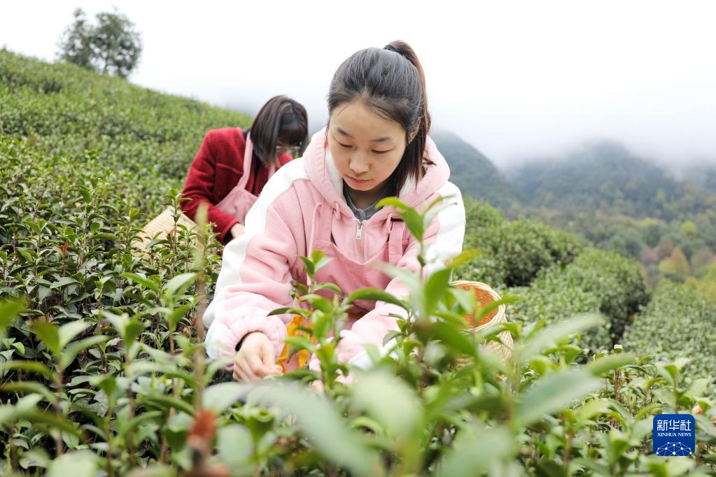 3月21日,在浙江省杭州市桐廬縣瑤琳鎮皇甫村茶葉基地,工作人員在采摘茶葉。