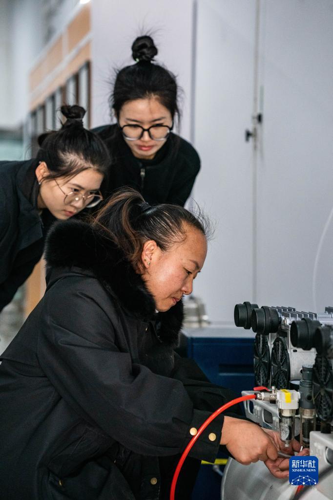 工作人員彭小清(前)和李曉莉(右)、殷鉞淼在香格里拉國家大氣本底站大氣成分業(yè)務(wù)用房對溫室氣體樣氣進(jìn)行壓縮除水(3月9日攝)。