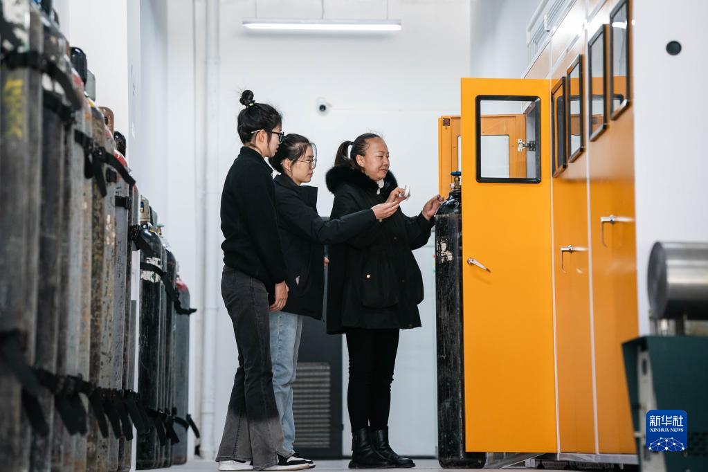 工作人員彭小清(右)和殷鉞淼(中)、李曉莉在香格里拉國家大氣本底站大氣成分業(yè)務(wù)用房更換溫室氣體氣相色譜儀氮氣瓶(3月9日攝)。