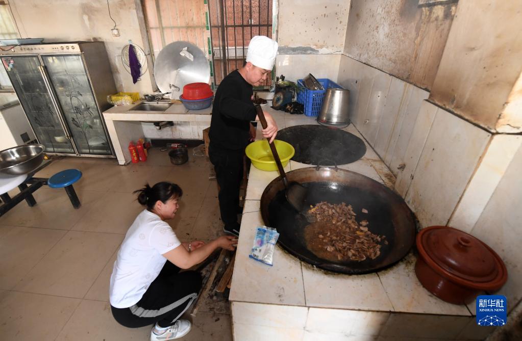 在廣西德??h東凌鎮那王小學(xué),黃永勇(右)和黃秀碧在給學(xué)生做午餐(3月22日攝)。