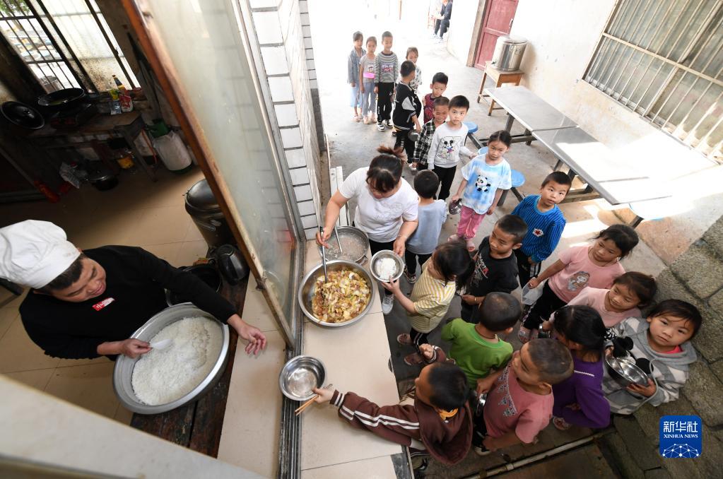 在廣西德??h東凌鎮那王小學(xué),黃永勇(左一)和黃秀碧在給學(xué)生分午餐(3月22日攝)。