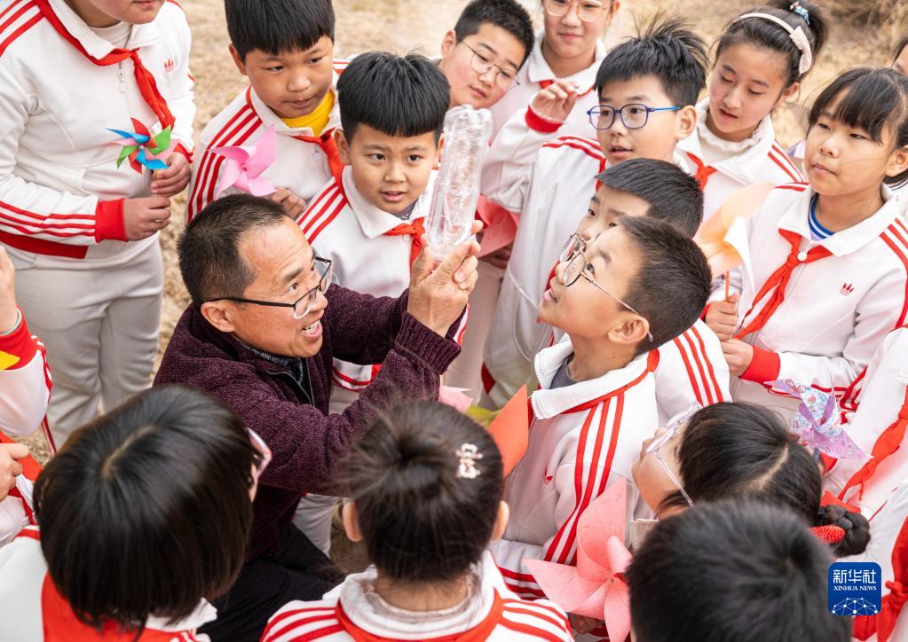 3月23日,在河北省唐山市豐南區氣象科普公園,工作人員和學(xué)生一起互動(dòng)游戲。