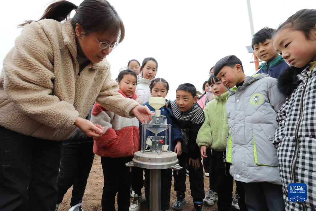 3月23日,河南省焦作市溫縣氣象局工作人員為小學(xué)生介紹雨量傳感器工作原理。