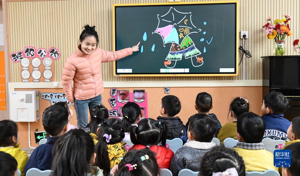3月23日,河南省濟源市愚公路幼兒園的老師在課堂上為小朋友們講解雨水的形成過(guò)程。