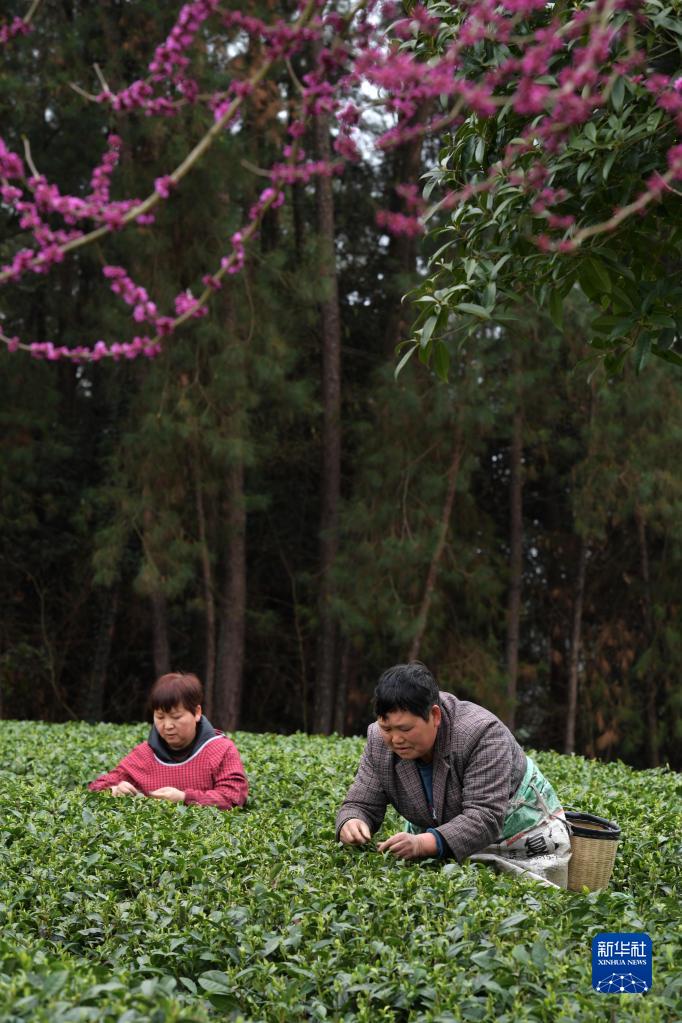 3月23日,村民在鳳岡縣永安鎮田壩社區生態(tài)茶園基地采摘春茶。