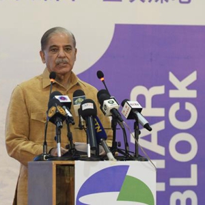 3月22日,在巴基斯坦塔爾, 巴基斯坦總理夏巴茲·謝里夫在塔爾煤田一區塊煤電一體化項目投產(chǎn)儀式上致辭。