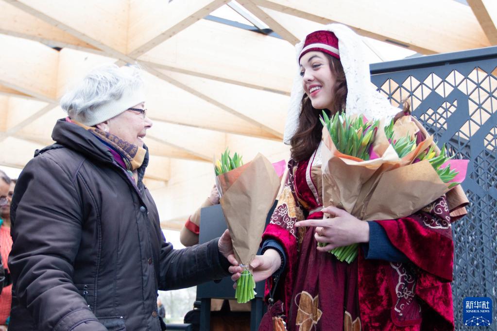 3月23日,在荷蘭利瑟的庫肯霍夫公園,首批入園游客獲贈郁金香花束。