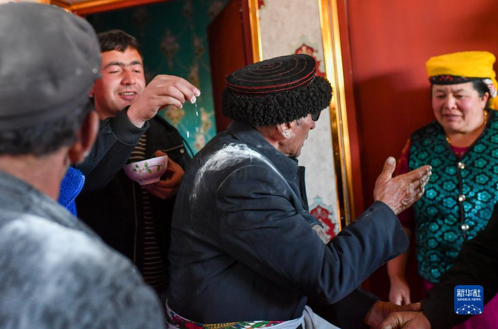 有客人來(lái)訪(fǎng),小兒子努爾卡熱木·都熱按傳統習俗把面粉撒在來(lái)訪(fǎng)者右肩,以示祝福(2023年3月21日攝)。