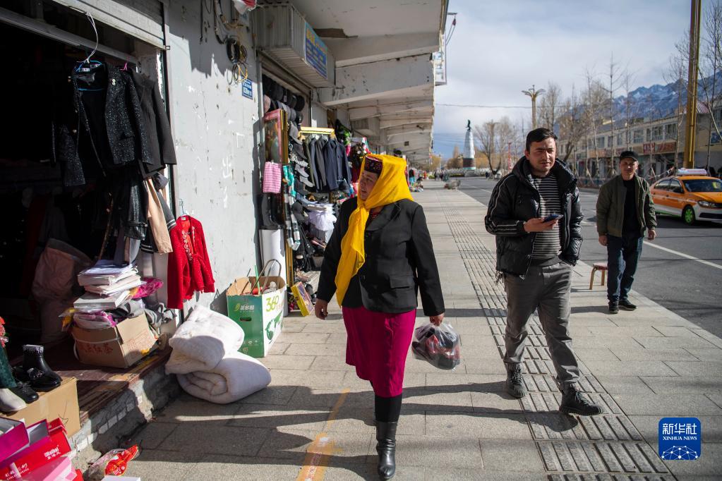 在縣城的一條商業(yè)街,努爾卡熱木·都熱(中)和母親那尼克·苦卡尼(左)逛街購買(mǎi)節日所需用品(2023年3月19日攝)。搬遷前,因交通不便,那尼克極少來(lái)縣城,從沒(méi)有去過(guò)喀什市城區。