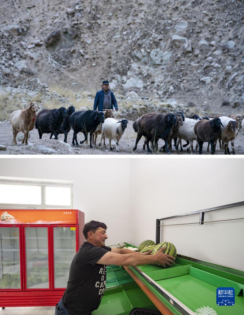 這是一張拼版照片,上圖為搬遷前,都熱·加爾曼在山谷里放牧(2018年11月16日攝);下圖為搬遷后,在新居旁的綜合市場(chǎng),都熱·加爾曼在新開(kāi)辦的商店內擺放準備售賣(mài)的西瓜(2020年6月24日攝)。