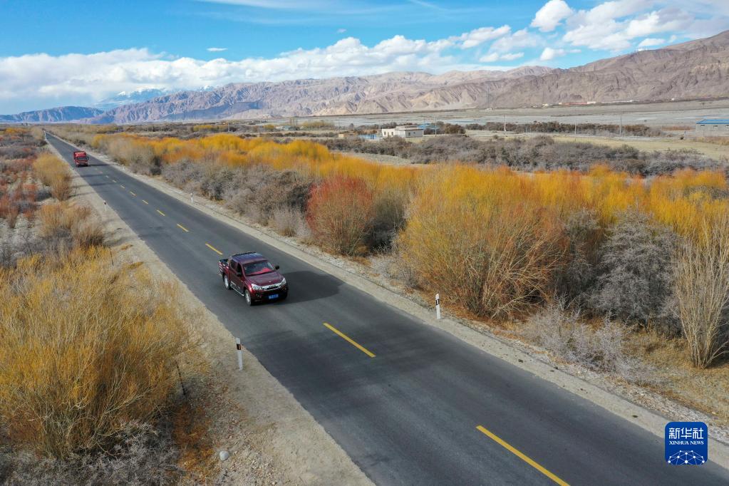 在縣城進(jìn)貨后,小兒子努爾卡熱木·都熱(前)開(kāi)車(chē)行駛在回愛(ài)民村的路上(無(wú)人機照片,2023年3月19日攝)。自2021年10月份買(mǎi)車(chē)后,行駛總里程已超67000公里。