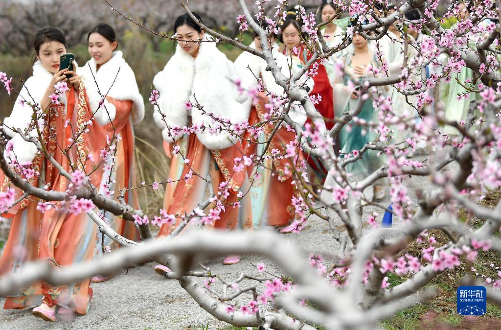 3月24日,在陜西省西安市臨潼區零口街道零塬村,漢服愛(ài)好者穿行于桃園中。