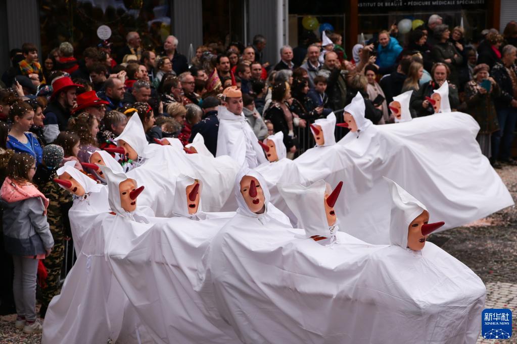 3月19日,在比利時(shí)東部的小城斯塔沃洛,裝扮成“白衣人”形象的表演者參加狂歡節游行。