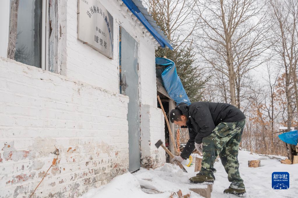 3月23日,王劉洋用斧頭清除彩芹瞭望塔塔下小屋門(mén)前的冰雪。