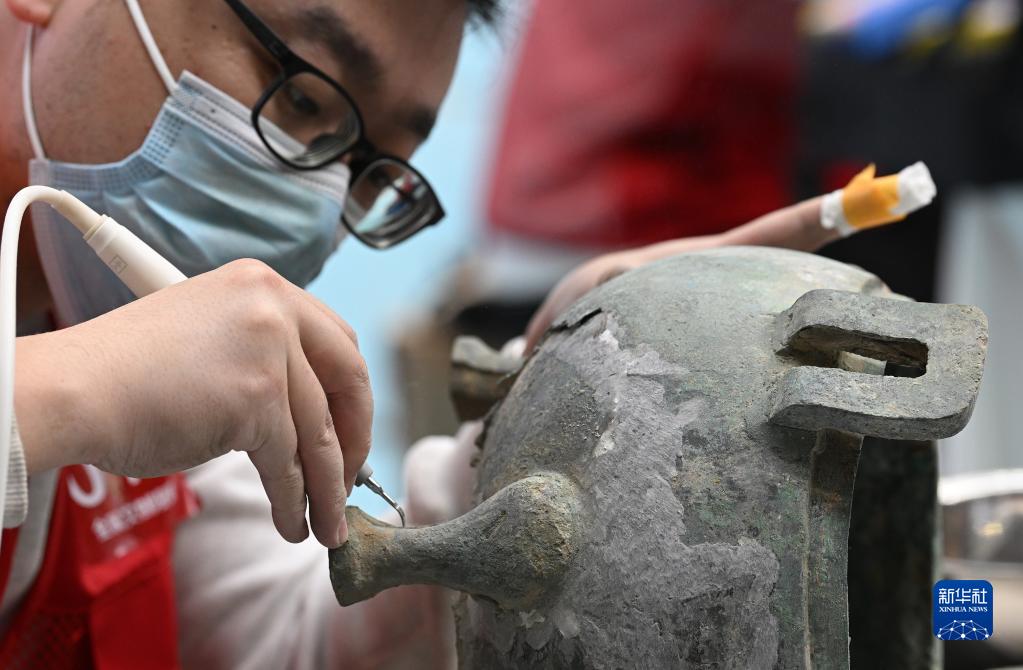 一位參加金屬文物修復師比賽項目的選手在現場(chǎng)進(jìn)行文物修復(3月25日攝)。