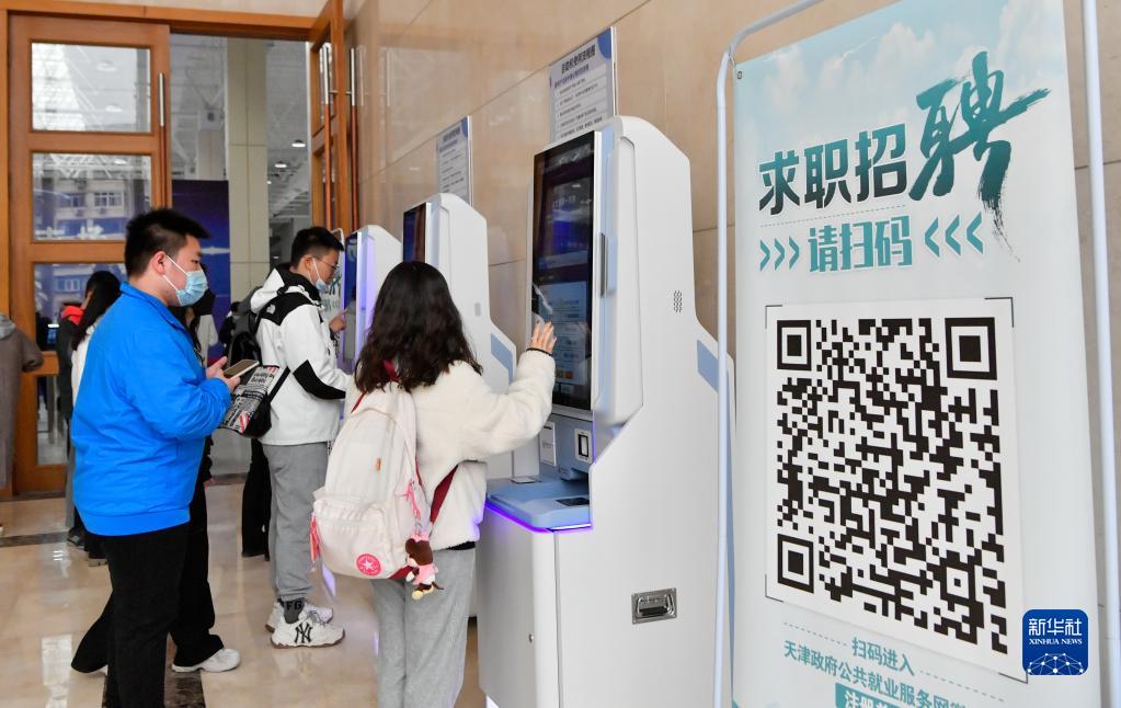 3月25日,在中國(天津)人力資源發(fā)展促進(jìn)中心,求職者通過(guò)自助服務(wù)機器查看招聘信息。