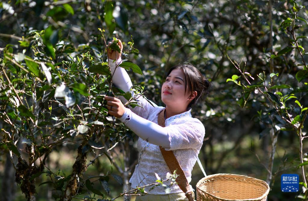 3月25日,景邁山茶農張小莉在古茶林里采茶。