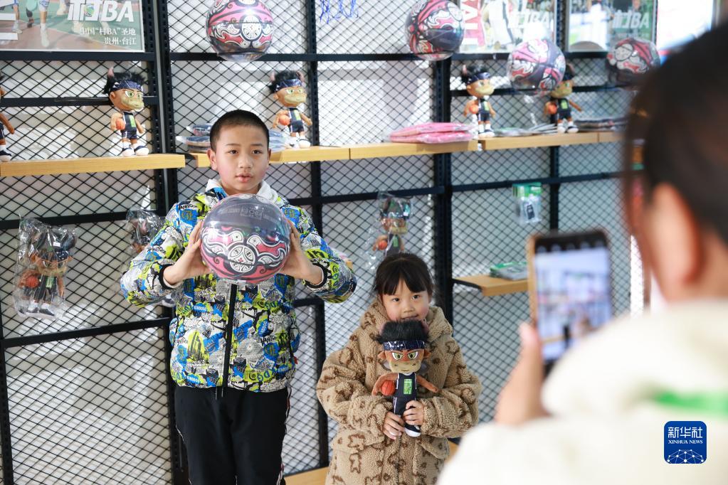 3月25日,兩名兒童在“村BA官方線(xiàn)下體驗館”內拍照留念。