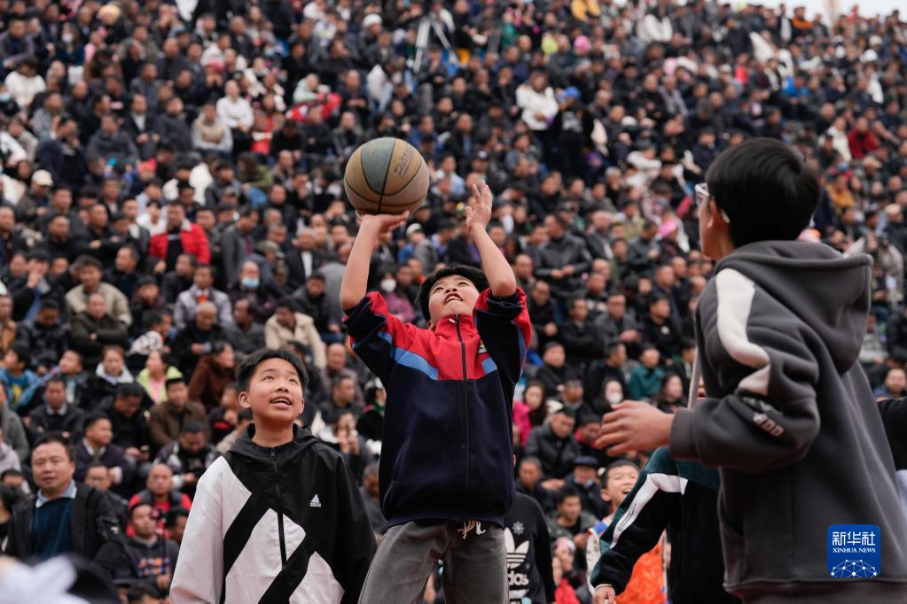 3月25日,臺盤(pán)村的小朋友在比賽前打籃球。