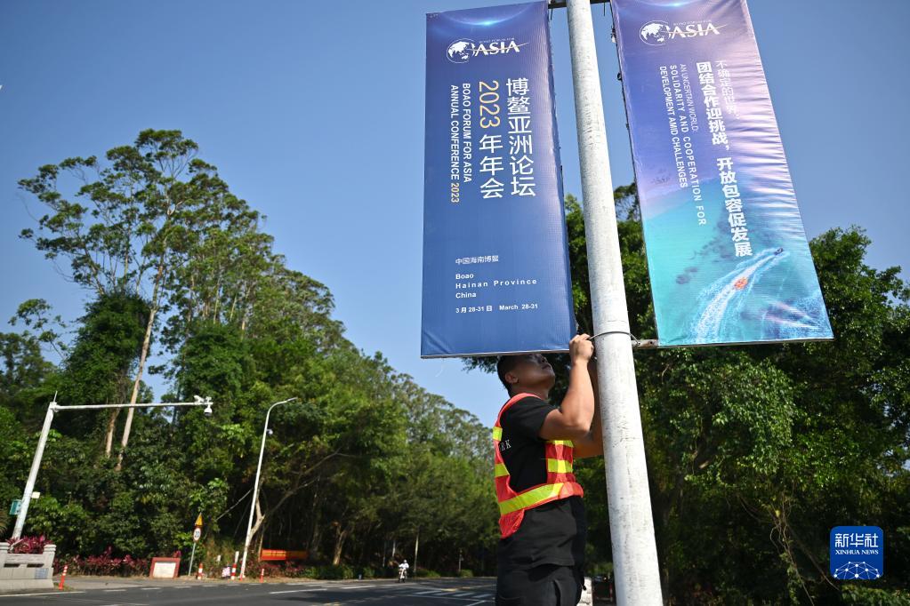 3月23日,工作人員在博鰲鎮懸掛博鰲亞洲論壇2023年年會(huì )主題宣傳牌。
