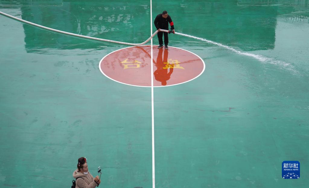 3月26日,“村BA”決賽開(kāi)始前,一名工作人員清洗球場(chǎng),一名當地觀(guān)眾在場(chǎng)邊做視頻直播。