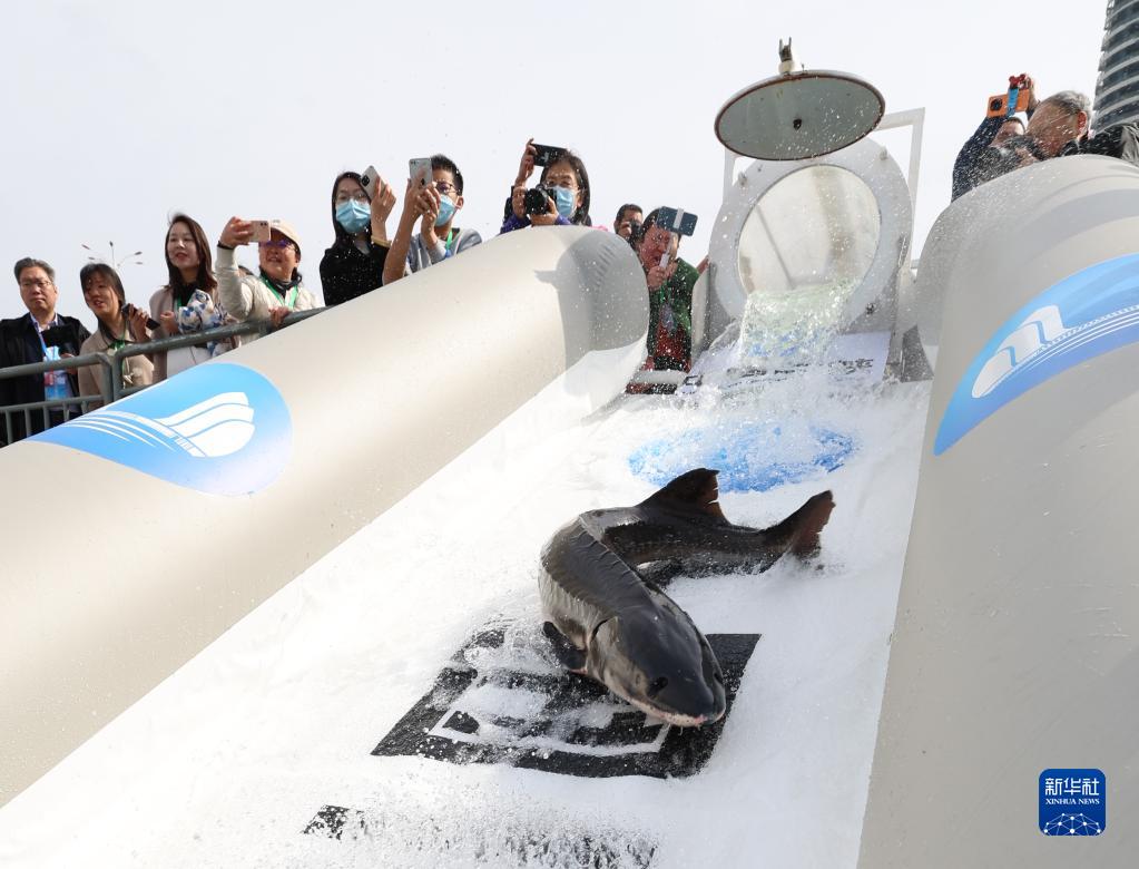 3月26日,人們在活動(dòng)現場(chǎng)放流中華鱘。